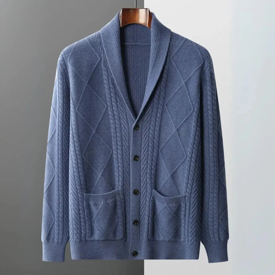 Crafted from 100% extra-fine Merino Premium Fabric, this cardigan combines luxurious softness with timeless sophistication. Featuring a shawl collar and intricate cable-knit detailing, it delivers warmth, comfort, and effortless elegance for every occasion.